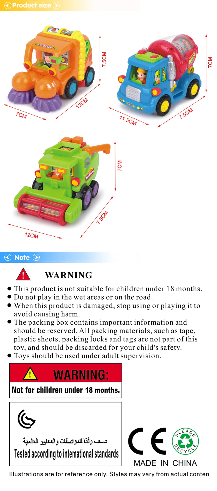 Description Happy Professional Cartoon Car. This friction car set includes 3 great vehicles with real moving action. It includes a street sweeper with actual spinning brushes, cement truck with turning mixer, and a harvest truck with spinning action. The colorful trucks will keep your child’s attention and leave them having endless fun. Wind up the toys and let them zoom right past your child as they laugh and smile trying to chase the trucks. The Happy Professional Cartoon Car is the perfect toy set for your child. NEW PRODUCT WITH FACTORY PACKAGING Safe, quiet, fun! No Batteries Required! Friction Powered, wind ’em up and let ’em go 3 Bright and colorful Professional Cartoon Car Recommended age: 18 months and above 3 different styles: street sweeper with actual spinning brushes, cement truck with turning mixers, and harvest truck