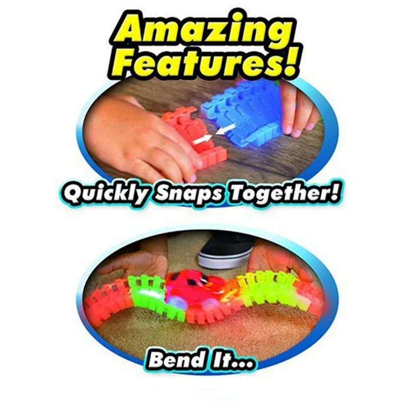 Includes 165 /220/240 track pieces, 1 LED light-up car, sticker sheet and instruction guide