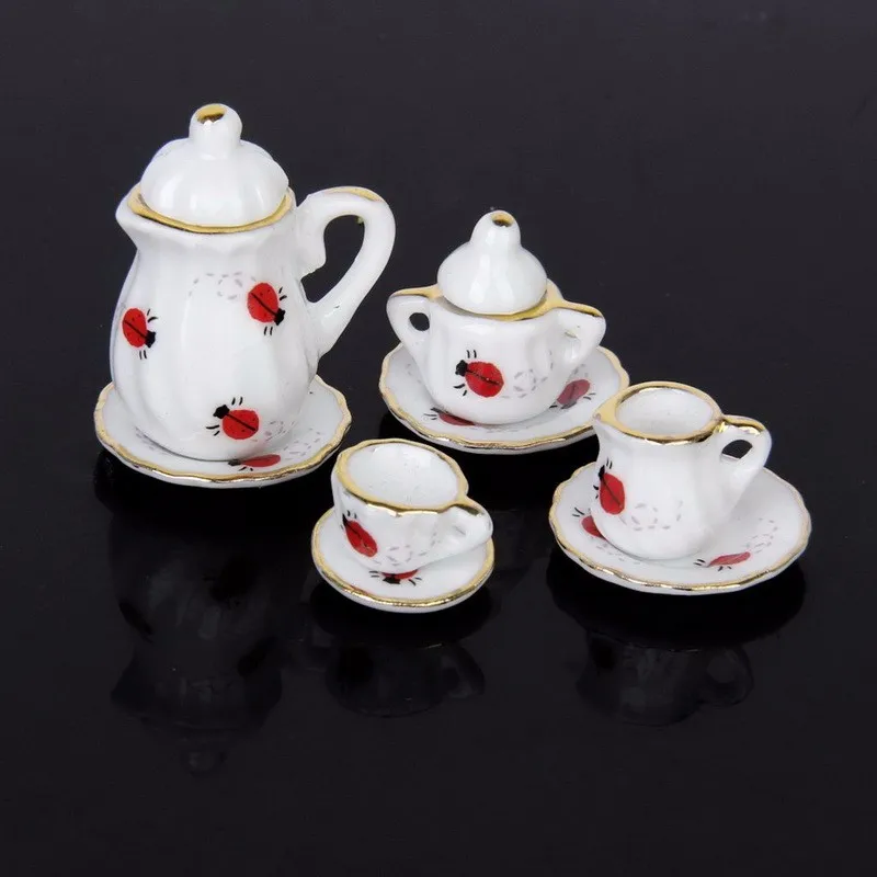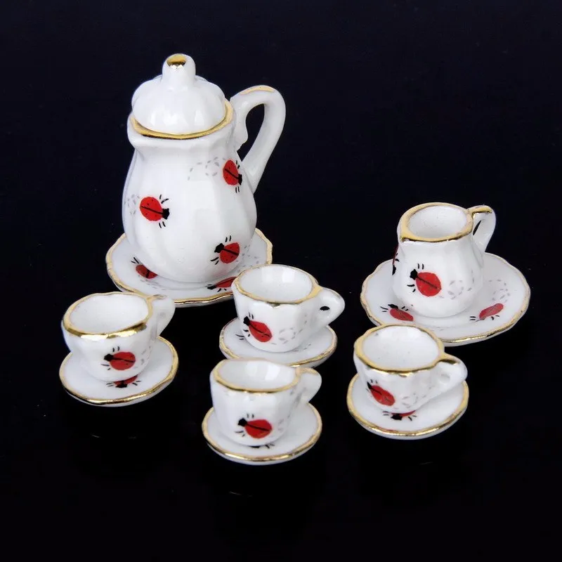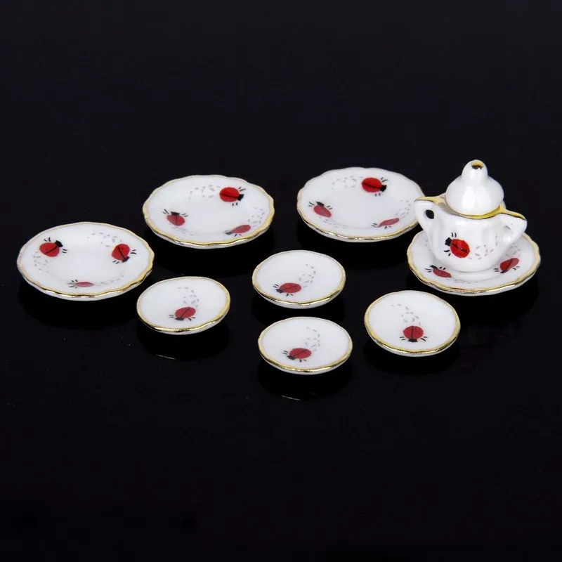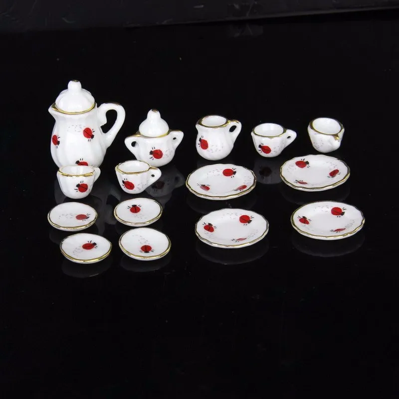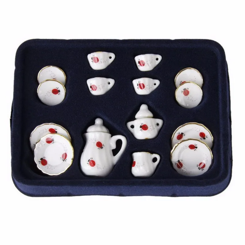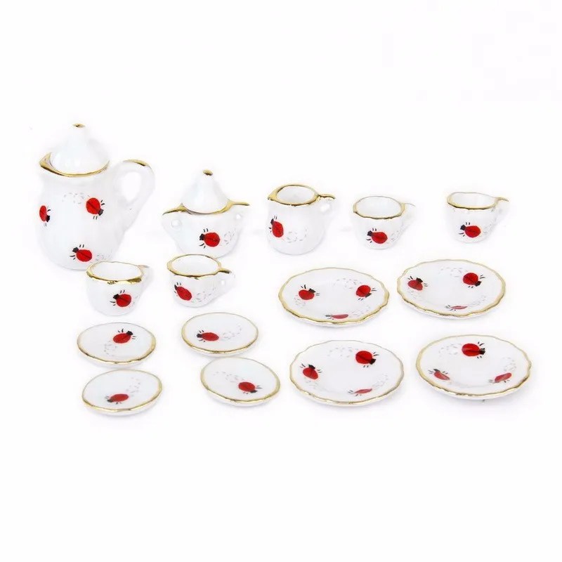 15Pcs 1/12 Doll House Miniature Dining Ware Porcelain Tea Set Dish Cup Plate Ladybug Print Free Shipping