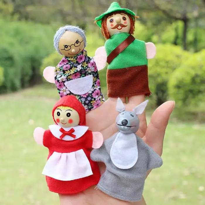 4pcs/Lot Kids Finger Puppets Doll Plush Toys Cute Little Red Riding Hood Wooden Headed Fairy Tale Story Telling Hand Puppets
