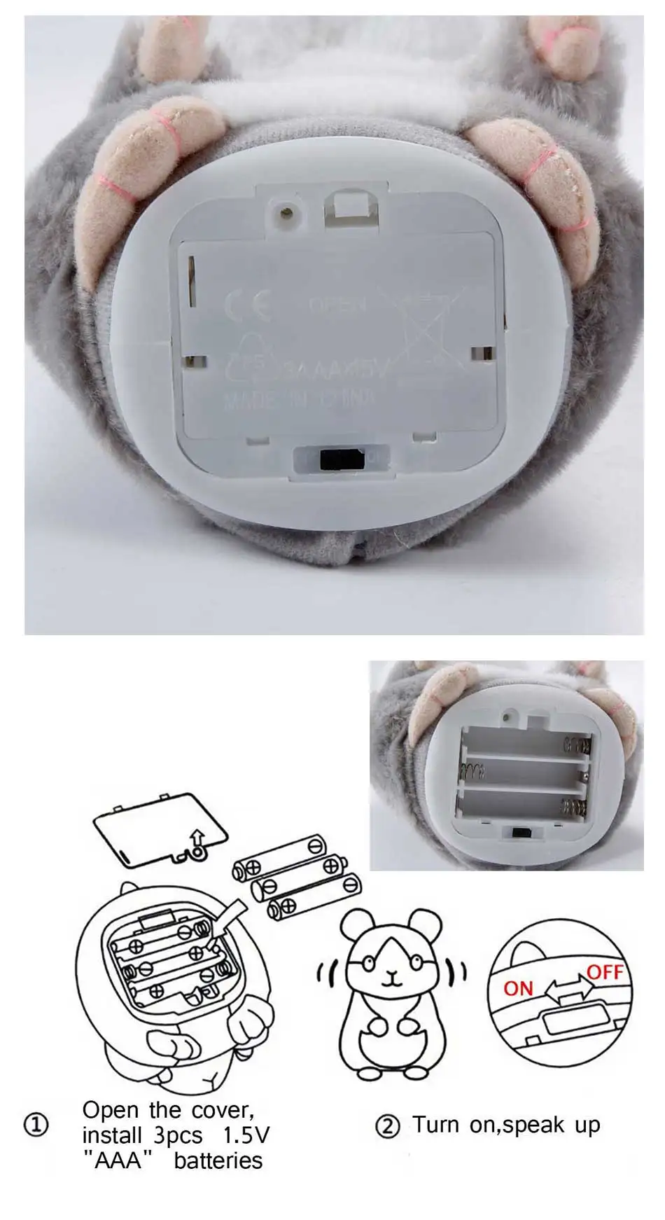 • Instructions: When you place 3 AAA batteries in it, Please turn the button to “ON” , then speak to him, and he will speak it follow you.