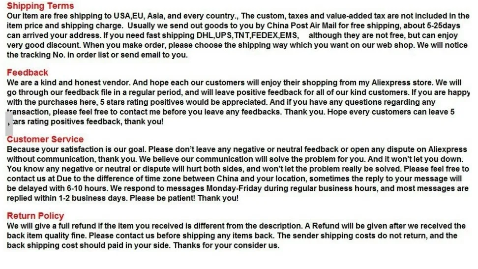 Note: about the shipping .if you have any question ,plese ask us first ,dont open disputes first。we will first time To solve the problem 。thanks for understand