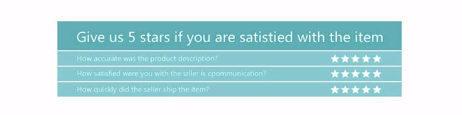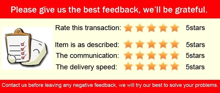 1. If you are satisfied about it,plese leave 5 Stars positive feedback. Thank you very much! 2. If you are satisfied about our product, please share with your friends. 3. If you want Wholesale please contact us. 4. For any reason if you are not satisfied with purchase,please contact us in through \\\’\\\’My Messages\\\’\\\’ or \\\’\\\’Ask Seller Questions before leaving neutral or negative feedback. 5. You satisfactory is our ultimate aspiration.