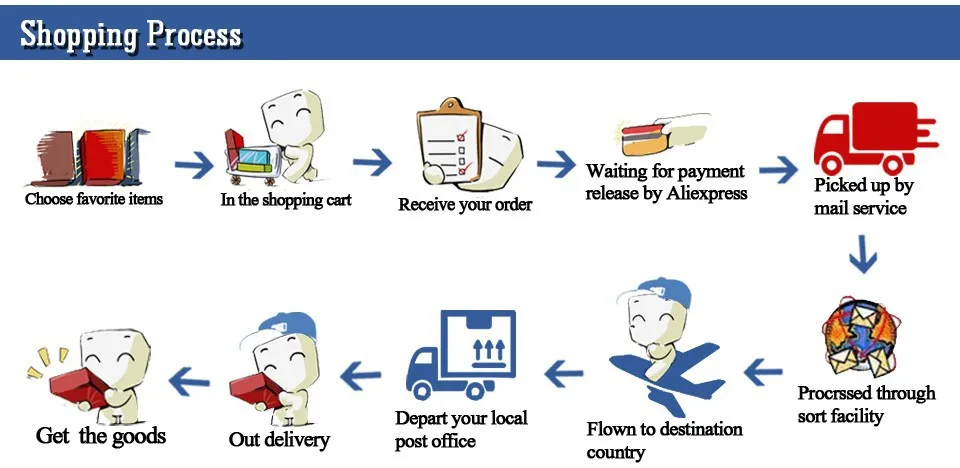 1. Please make sure your Full name, Address Zip Code are correct. The Russian customers please provide your full name in 3 words. 2. Free shipping by China Post Air Mail. After sending out your package, we will write down tracking number in Aliexpress, It will update online about 5~10 days. 3. If you don\\\’t receive the item over 25 days,please contact us,we will track the goods and reply to you as soon as possible. Please do not open a dispute without contacting us! Note We are not responsible for any custom duty or import tax that may occur. At the same time for avoid custom duty for you, items are shipped with very low price.