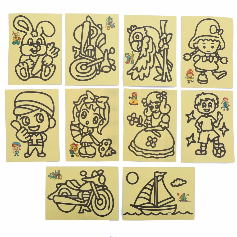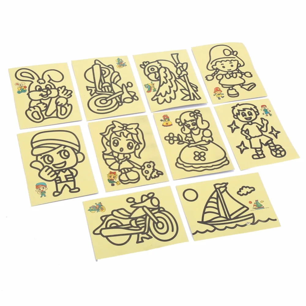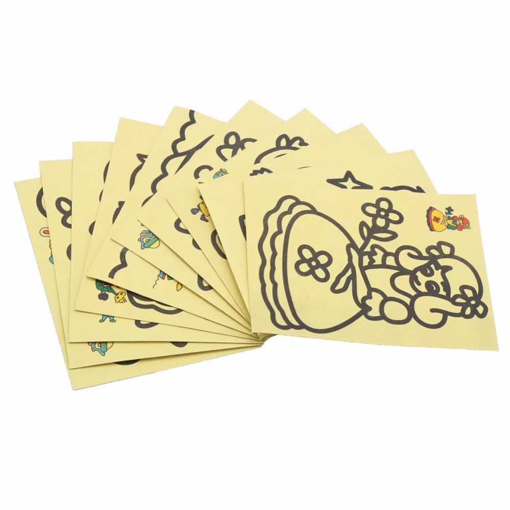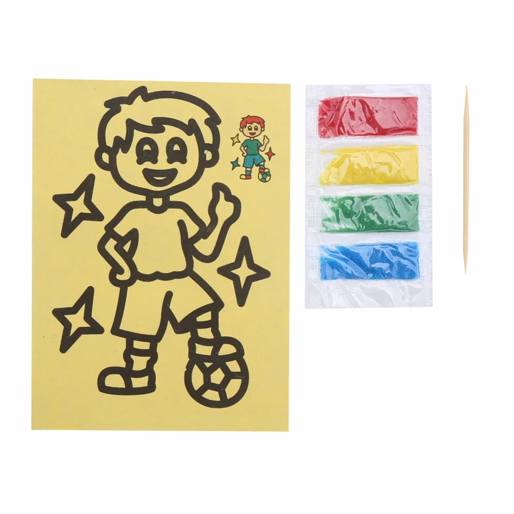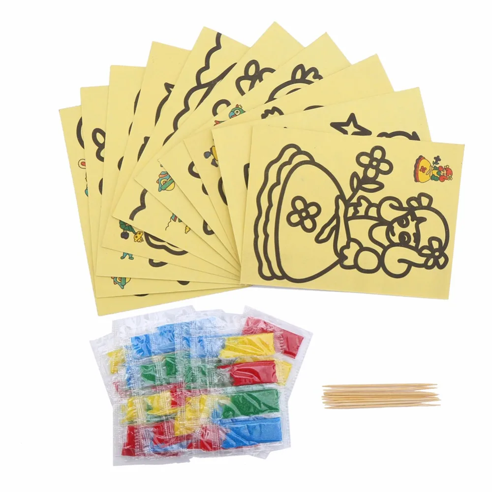 Material:Papaer and Sand Size:9x11CM Package: 10PCs Sand Paintings+ 4 color sand +1 toothpick NOTE : The products will be sent randomly