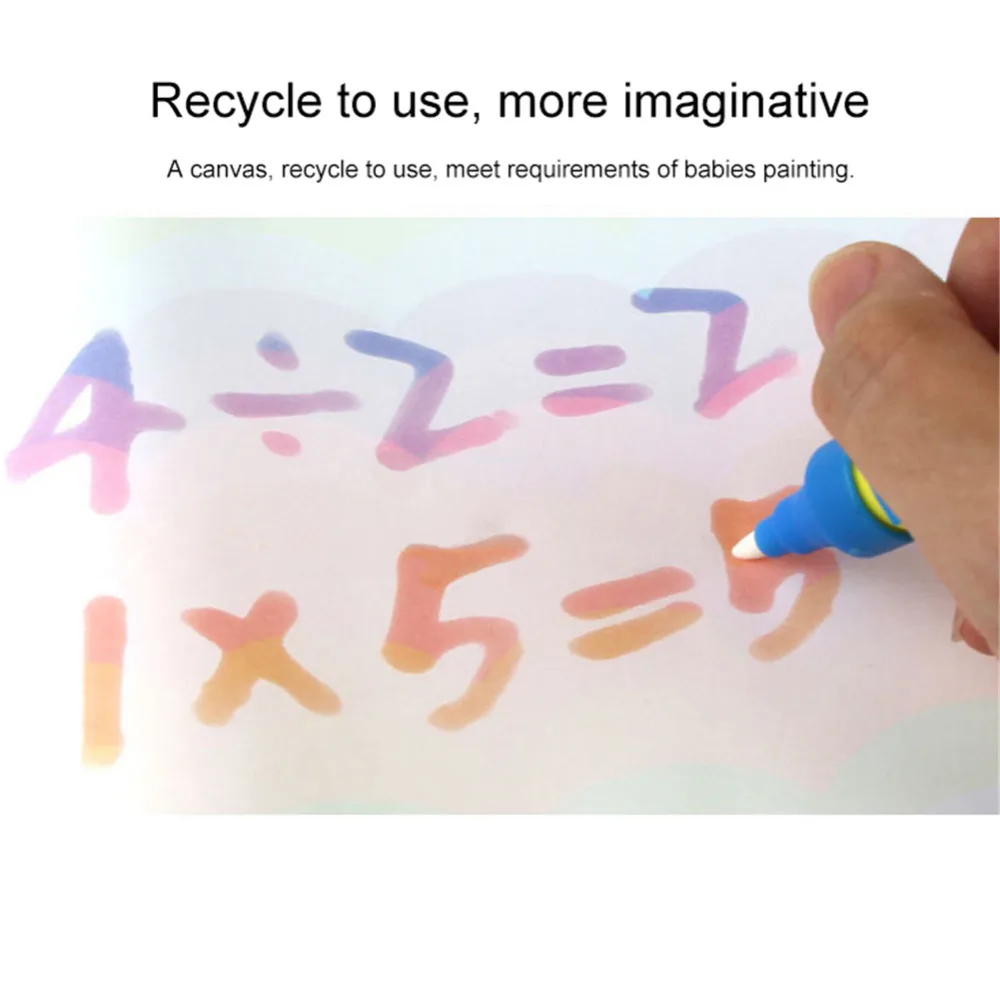 The pen uses water as its dye, which is convenient and clean and you don’t need to worry that it might be eaten by the baby. The color of the canvas changes immediately after painting, and the color is quite bright and vivid; the color will disappear automatically minutes later. The mat can be reused and its very environmentally friendly; you have no need to worry that your baby may smear himself or home anymore.