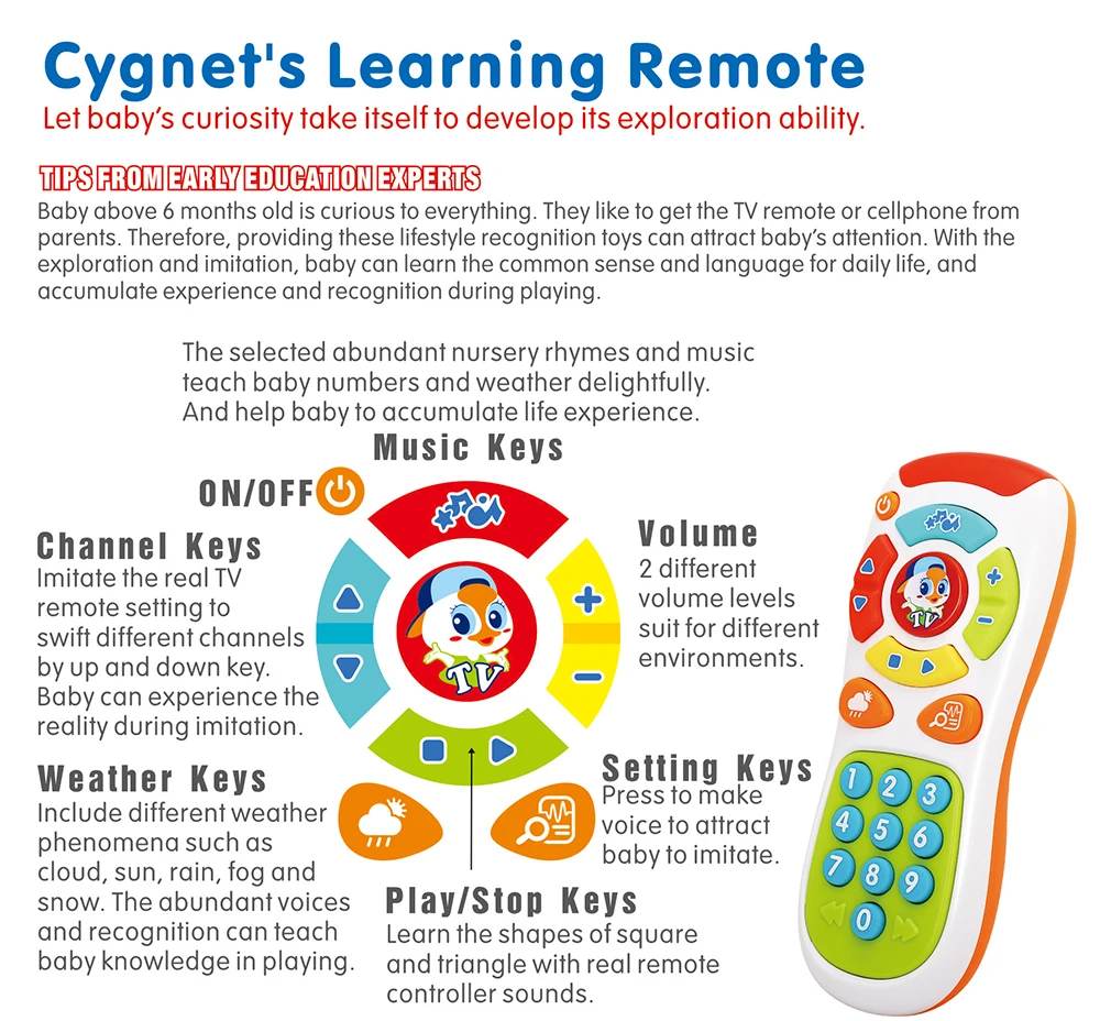 Click & Count Remote Your child can enjoy imitative fun while learning numbers, colors, and shapes with a TV remote control toy that looks just like mom and dad’s! This toy lets your child surf through nine different channels that include pretend news and weather for role-play fun. Volume and channel control buttons teach the concept of opposites. Plus, familiar phrases like “Breaking News” offer a playful real-life experience for fun imitative play. Baby Can Click His Way To Playtime Learning Fun It clicks with baby’s development.Pressing buttons helps give motor skills a fun workout. The realistic styling and light-up screen inspire early role play fun. And the lights, fun music, phrases and bright colors help strengthen important senses like sight and hearing! Click On The Learning Put little ones in ‘control’ with their very own learning remote! Helps give baby’s fine motor skills a “push” in the right direction. Look what you did! Making things happen helps baby discover cause & effect. TV remote toy is for children 6 months to 3 years old; 2 AAA batteries are not included. Specification: Materail:ABS Plastic Product size:6.5*4*17cm Package size:16*5.5*22cm Weight:about 0.252kg Time to Market: April 2017 Package included: 1PC* Click and Cound Remote