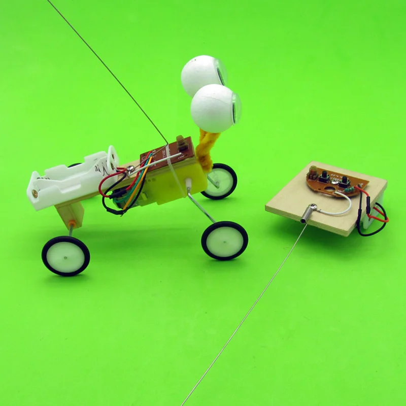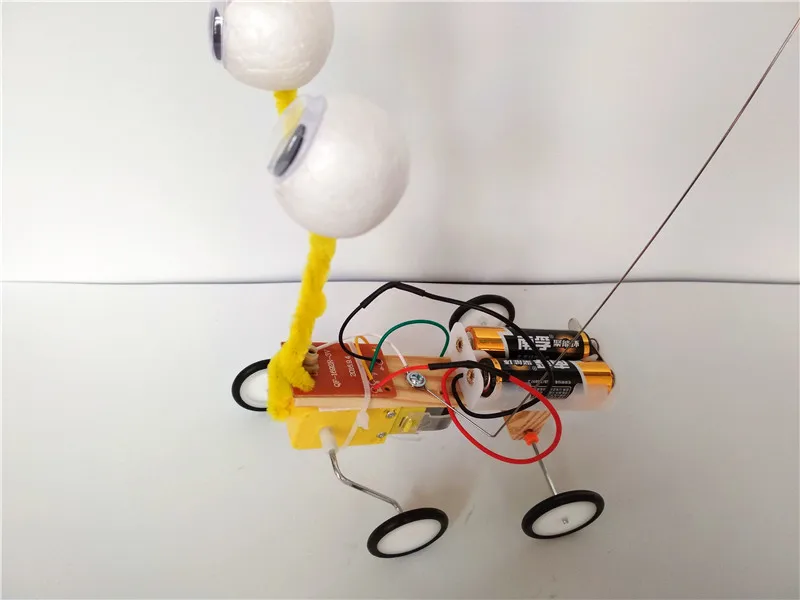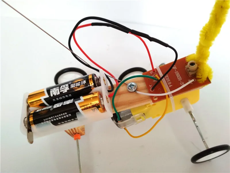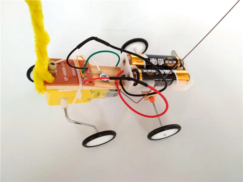 Product material:wood, electric elements, battery box, wires, plastic wheels.