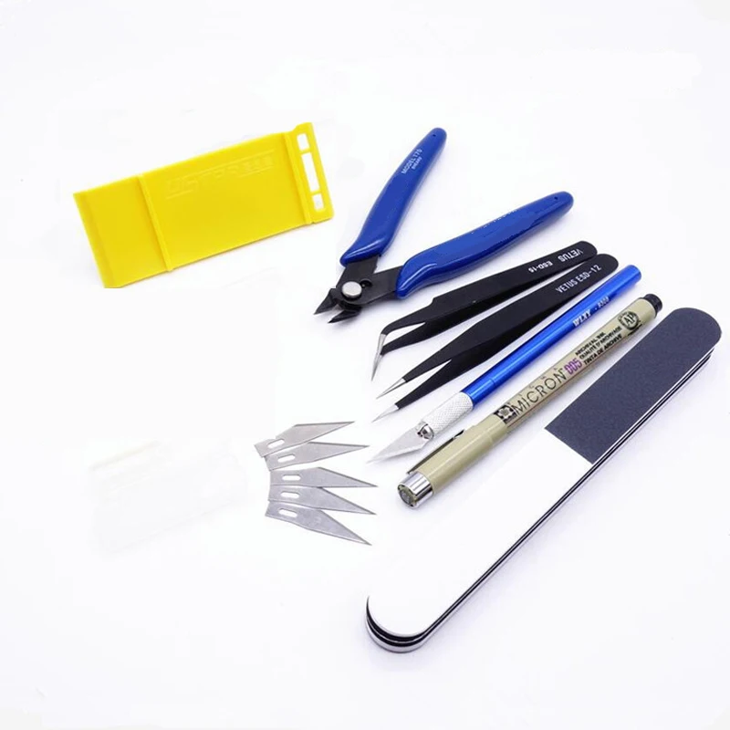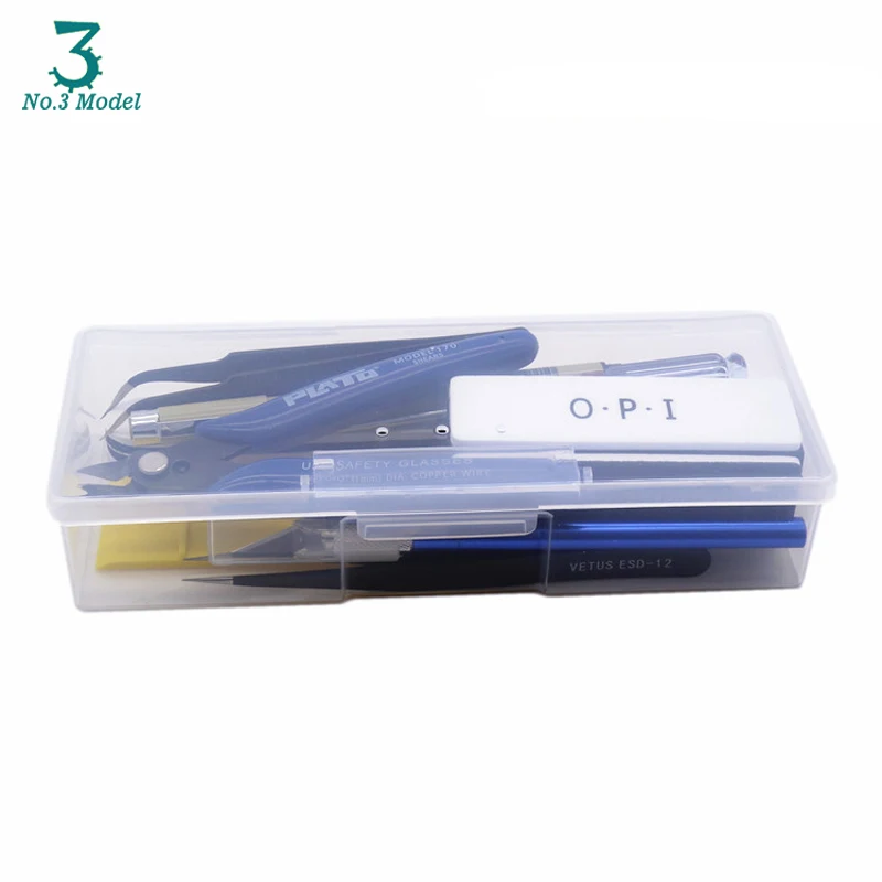 Set 3 Contents : Side Cutter Plier x 1 Straight Tweezer x 1 Curved Tweezer x 1 Parts Separator x 1 Pen Knife x 1 Pen Knife Blade x 5 Abrasive Strip x 1 Cherry hook pencil x 1