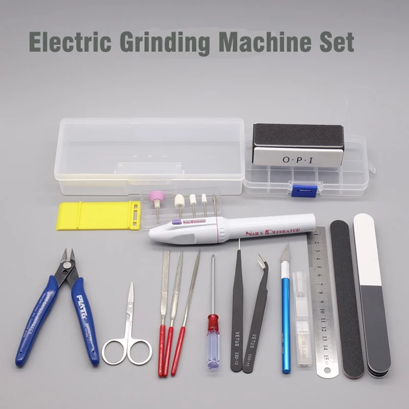 Set 1 Contents : Side Cutter Plier x 1 Straight Tweezer x 1 Curved Tweezer x 1 Parts Separator x 1 Flat File x 1 Half Round File x 1 Three Angle File x 1 Parts receive case x 1 Pen Knife x 1 Pen Knife Blade x 5 Crossed Screwdriver x 1 Electric Grinding Machine x 1 Diamond Cone x 1 Small Grinding Cone x 1 Grinding Cone x 1 Felt Cone x 1 Emery Head x 1 Cuboid 4 surface Abrasive Strip x 1 Steel rule x 1 Abrasive Strip x 1 Black Sand Abrasive Strip x 1 Mini Tool Box x 1 Mini stickers scissors x 1