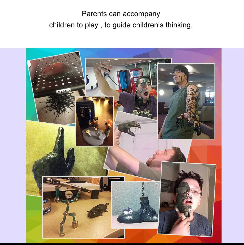 Product Features: 1. It has a magnetism and a strong plasticity 2. Suitable for all ages to play; it is beneficial to the development of children’s intelligence also helps adult decompress, and prevent senile dementia in a certain extent Product Parameters: 1. Material: silicone grease 2. Type: plasticine 3. Product Size: about 7 * 2.5 cm / 2.76 * 0.98 in Packing List: 1 X 50g plasticine 1 x magnet 1 x iron box 4 X eyes 1 Xmanual If You Like This Item,Please Add It To Your Wish List, |