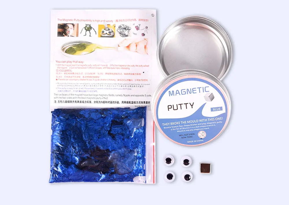 Contains: 1 powerful magnet, aluminum mouth box, 1 box of magnetic clay, 4 eyes, 1 manual