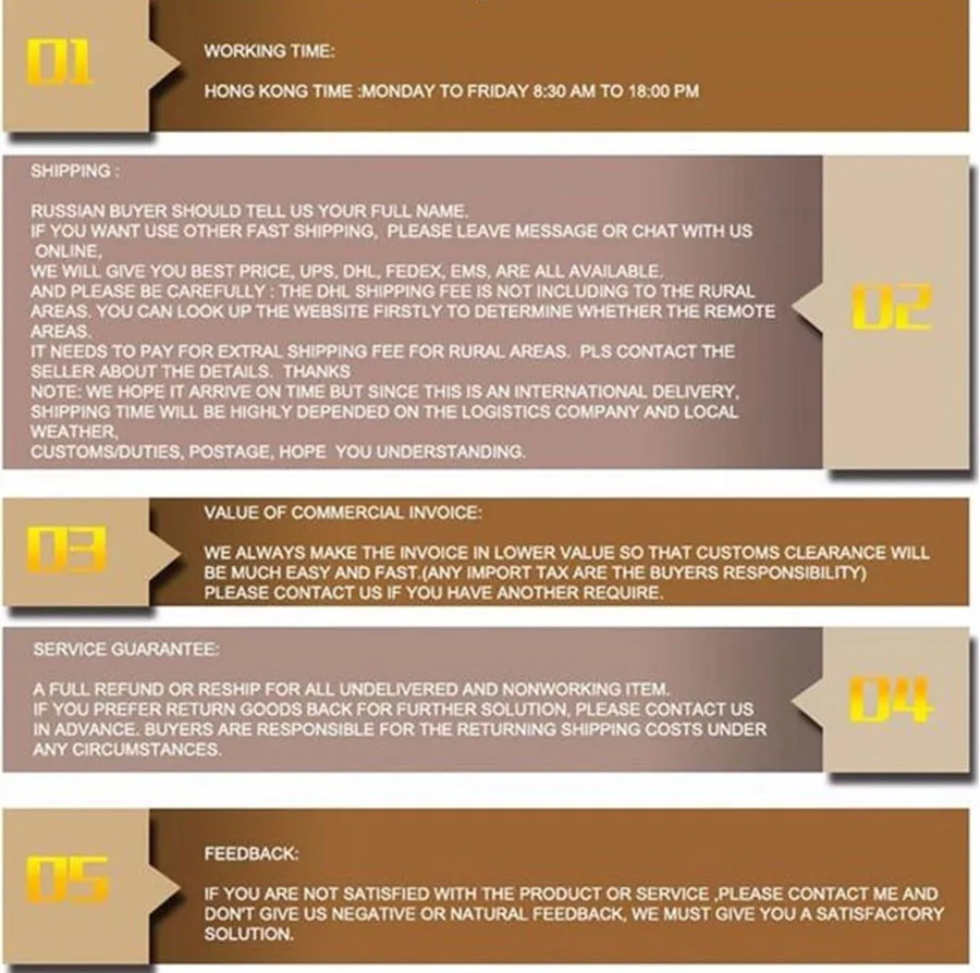 If your item haven’t arrive on time or have any problems about the item. Please feel free to contact to me first, I will try my best to help solve it ASAP! Please don’t leave the neutral or negative feedback to us before you contact me solve the problem.