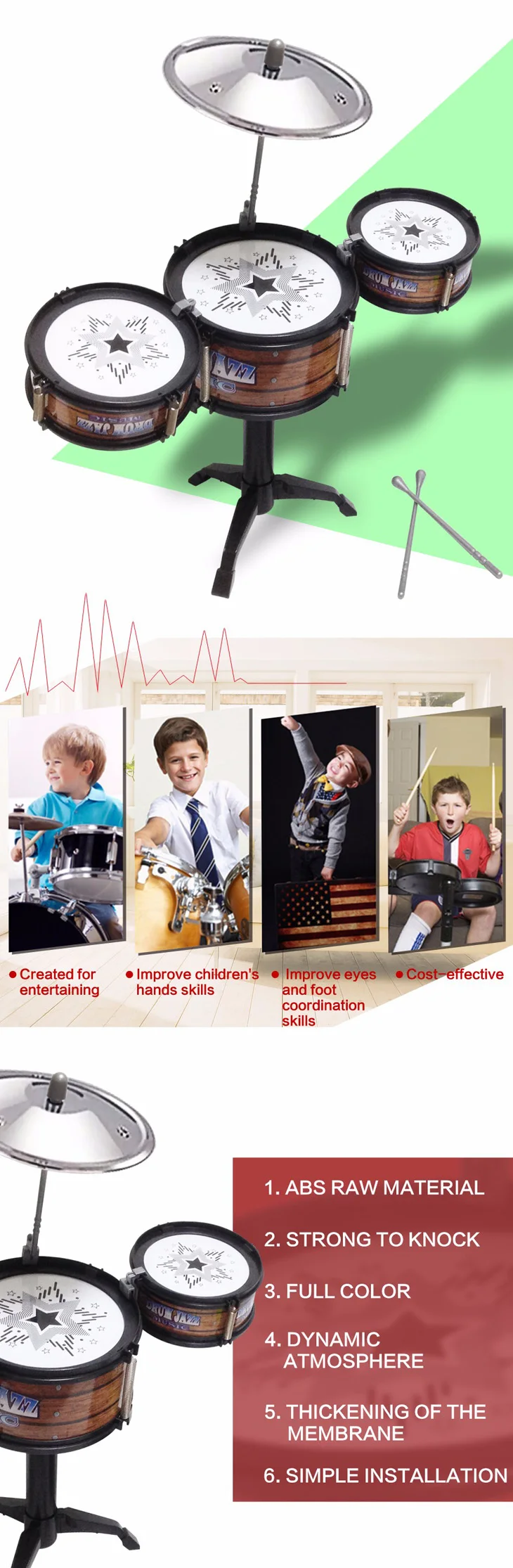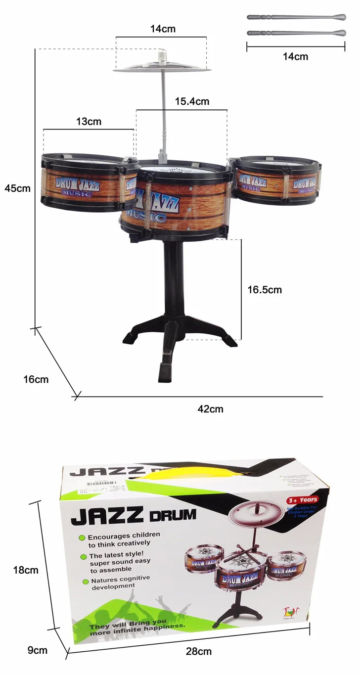 Latest Design DIY Child Kids Jazz Drum Child Kids Jazz Drum Cymbal Sticks Rock Set Christmas Gift Music Educational Toy This item picture size have something error of real items,please notice it. Have an aspiring musician in the house? Want to discover your child’s musical talents? Get ready to be the next rocking star! This unbeatable pieces Jazz Drum Play Set sure will impress your little heads. Easy toassembled by adults and it sure will provide hours of fun safely. This play set is not only created for entertaining but also helps to improve children’s hands, eyes and foot coordination skills. Your children will have fun banging on this drum set for hours and build up their self-confidence while playing. Great for both indoor and outdoor play. 100% Brand New Material: ABS Plastic and Metal Package B ox Size : 28*cm*18cm *9cm Realistic Sounds; Easy to Assemble, best gift for kids In The Box: l 1 x Jazz Drum Toy Please kindly note : Items will be repackaged to save your shipping charge & to be environmentally friendly. We guaranty the item will be protected well in buble bags, No retail box! Feature: Encourages Children to think Creatively. The Latest style!Super sound easy to assemble. Natures cognitive development.