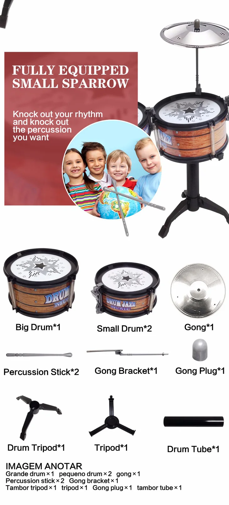 GLOBAL DRONE Children Jazz Drum Toy Cymbal Sticks Rock Set Musical Hand drum Kids diy funny Drums Gift Toy