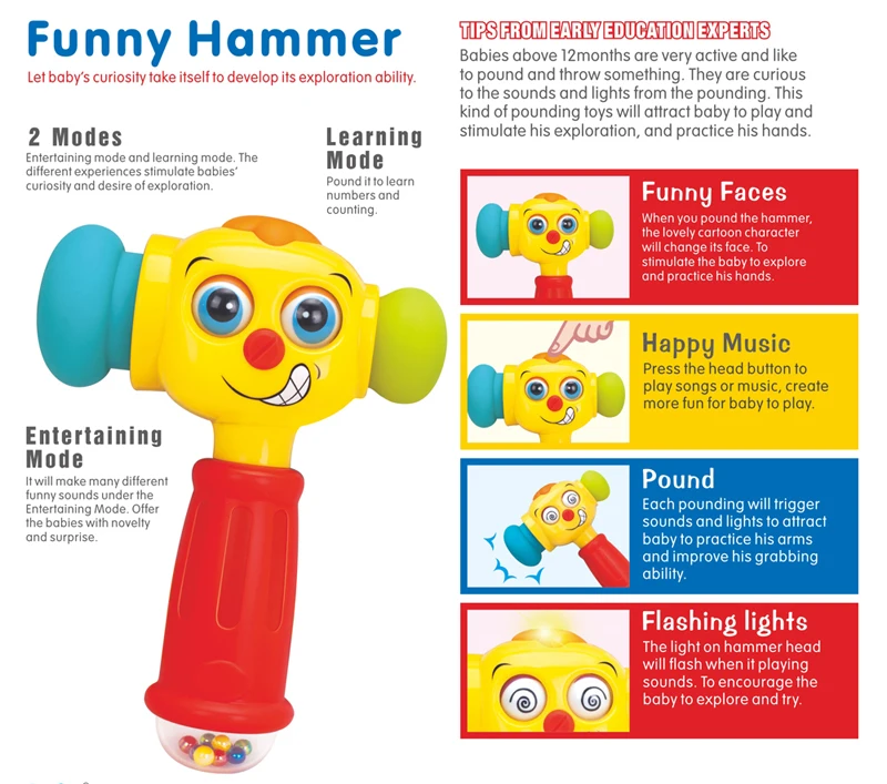 NEW PRODUCT WITH FACTORY PACKAGING Interesting hammer, installed with music. Environmental ABS materials. Help to improve baby’s operation ability and brain development. Lovely and colorful,being attractive to children. Safe and non-toxic toys,without hurting baby’s skin. Specification: Materail:ABS Plastic Product size:12×5.5×16CM Package size:18×6.5×22CM Weight:about 0.25kg Time to Market: April 2017 Package included: 1PC* Baby Learn Hammer Toy