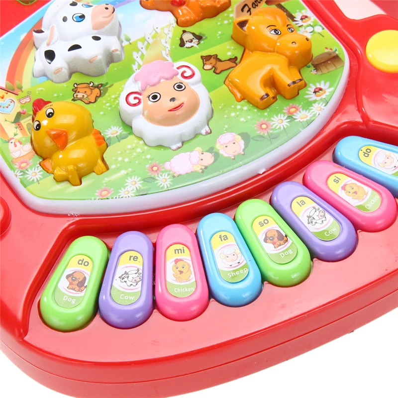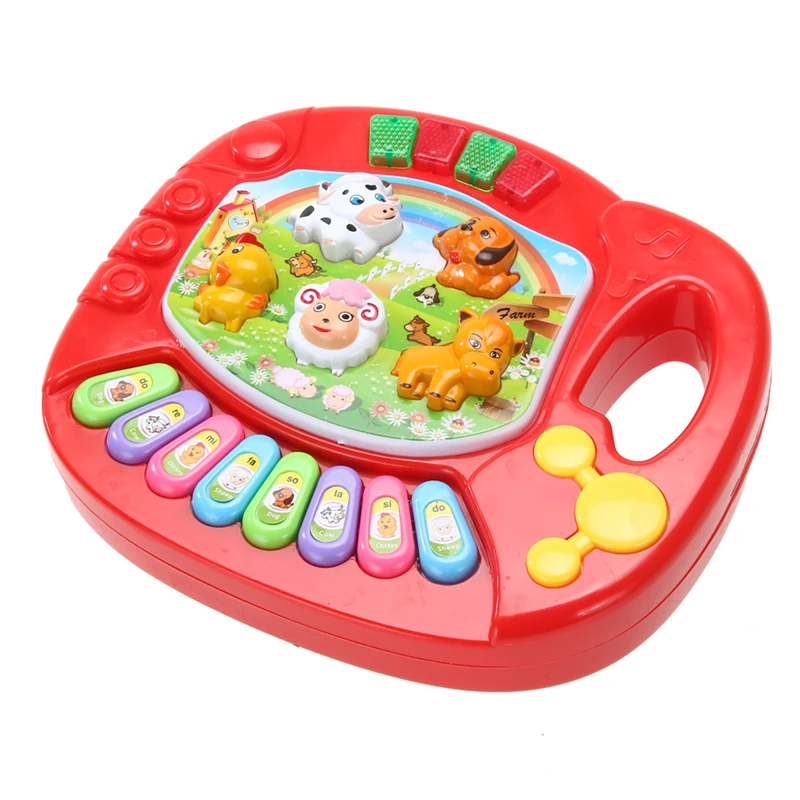 100% Brand new and high quality Kid’s animal farm piano music toy, upper part with handle, and dogs, lamb, chicken, dallas, pony five animals button. Baby can learn to recognize different colors, training color recognition ability, perception of rich and colorful world. The bottom has eight music key: do re mi fa so la si do, can according to the music. The first key to conversion: it will ask what is the sheep or birds, horses, cattle, and so on, if you press the corresponding animal it will say: right, good, if you press the wrong, it will say: wrong, then look for, at the same time have music accompaniment. The second key to conversion: no matter which animals you press, corresponding Chinese name and animal calls will appear. The third key to conversion: different animal will have different music songs. The fourth key to conversion: different animal will have different music songs with the corresponding animal’s voice. The fifth key to conversion: Hint sound “DO RE MI” will ring, then the baby can play music belong to himself. Power: 3x AA 1.5V (Not Included) Color: Red, Yellow (We will send color at random) Size: Approx. 17.5 x 15.5 x 4cm/6.9 x 6.1x 1.6inch (L*W*H) Note: All the human’s voice in Chinese and in English! The key of the heart shaped is conversion! The babies under three years old aren’t recommended! 1 x Animal Farm Piano Music Toy