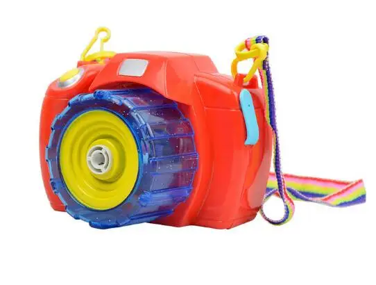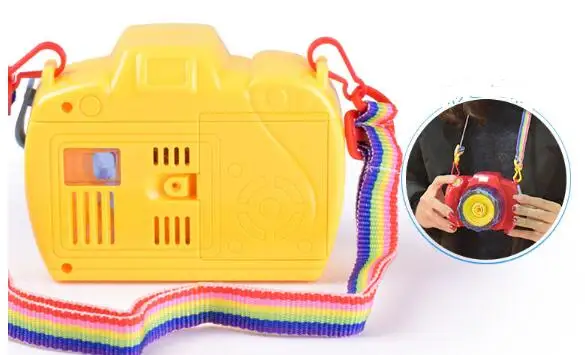 Designed with musical sound and flashing light, pretty dynamic Delicate design and excellent workmanship make it an interesting toy for kids It produces bubbles automatically, no mouth blowing, safe for children to play with Detachable band makes it easy to carry and not easy to drop Item Type: Toy Camera Material: Plastic Effect: Music& Light Powered By: 3*AA Ordinary Batteries(not included) Suitable for: Children (3-6 years old) Size: 12*9*8.5cm