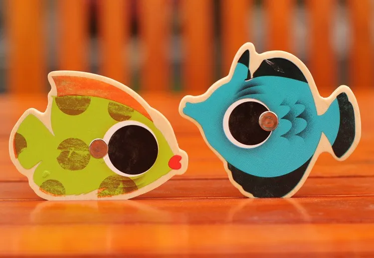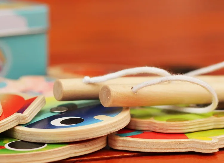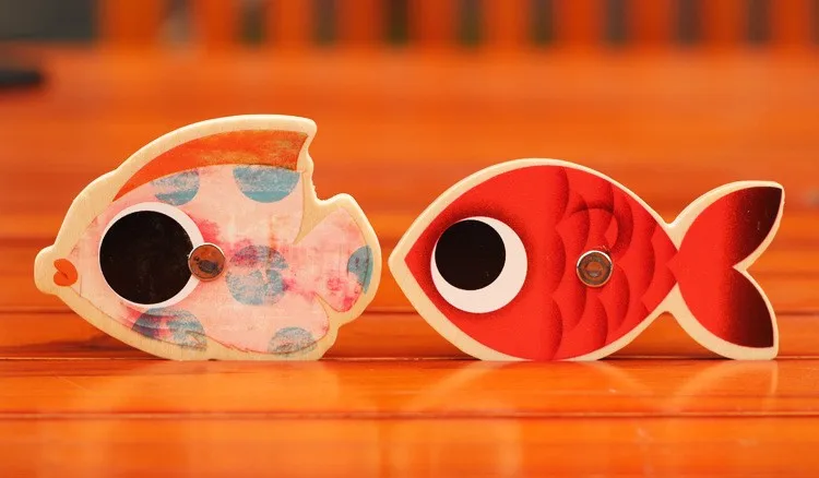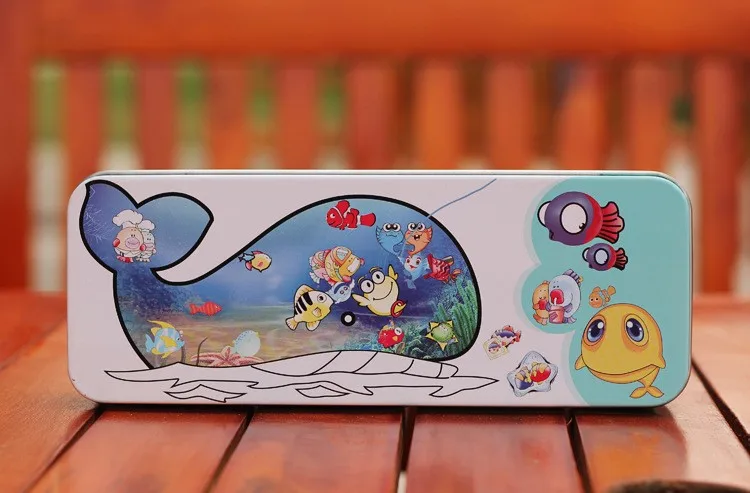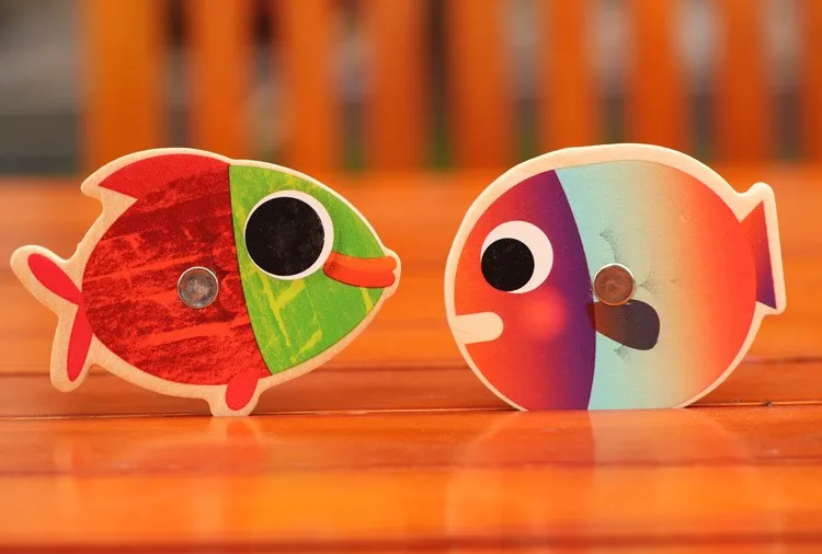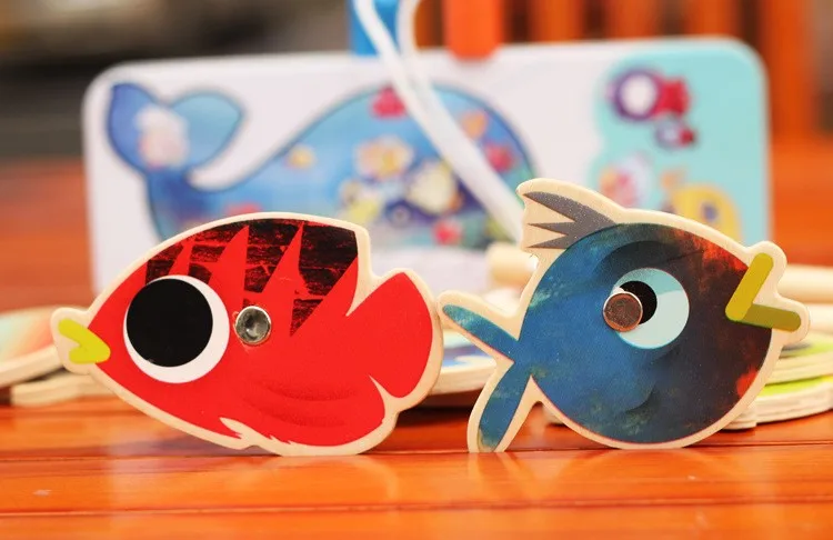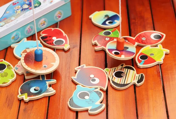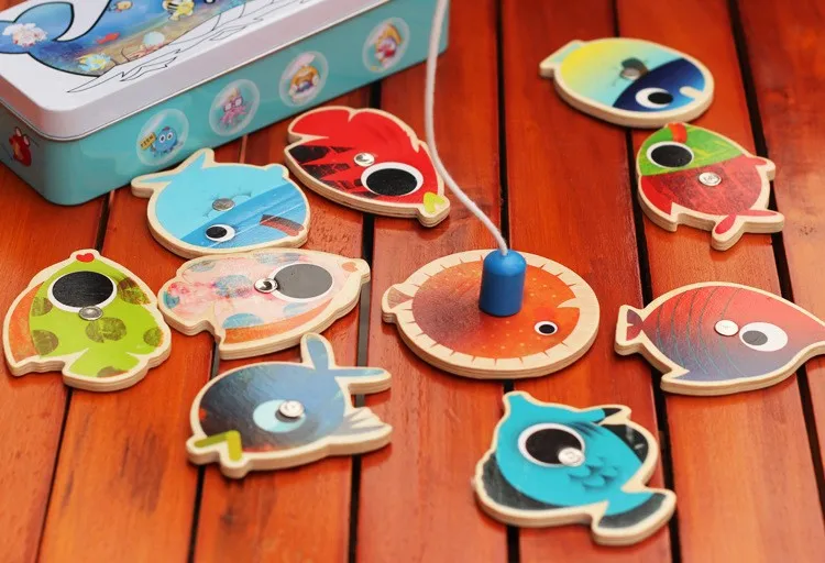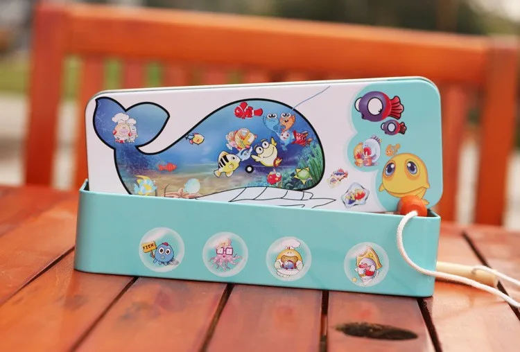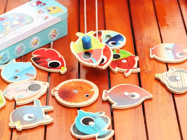 Very High quality fishing toy!!! Good wood+good paint+good magnet+good iron box Material: Wood School-age: more than one year old Packaging: Iron Box Tin Box size: 19*7*5cm Fish size: 5-6 cm It contains: 2 fishing rod + 14 fish