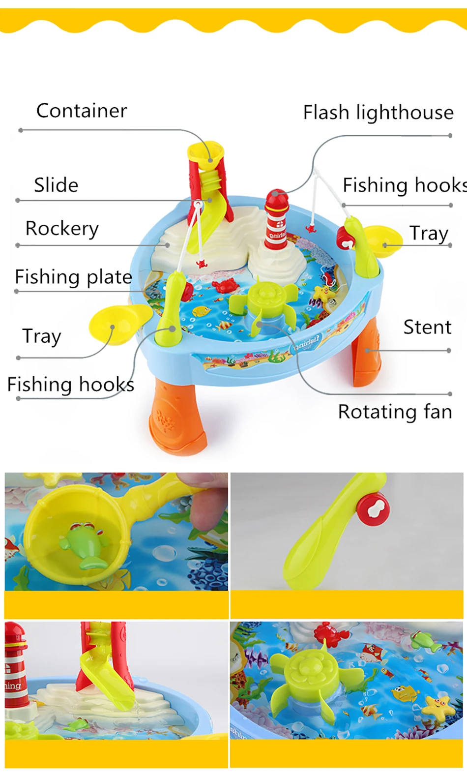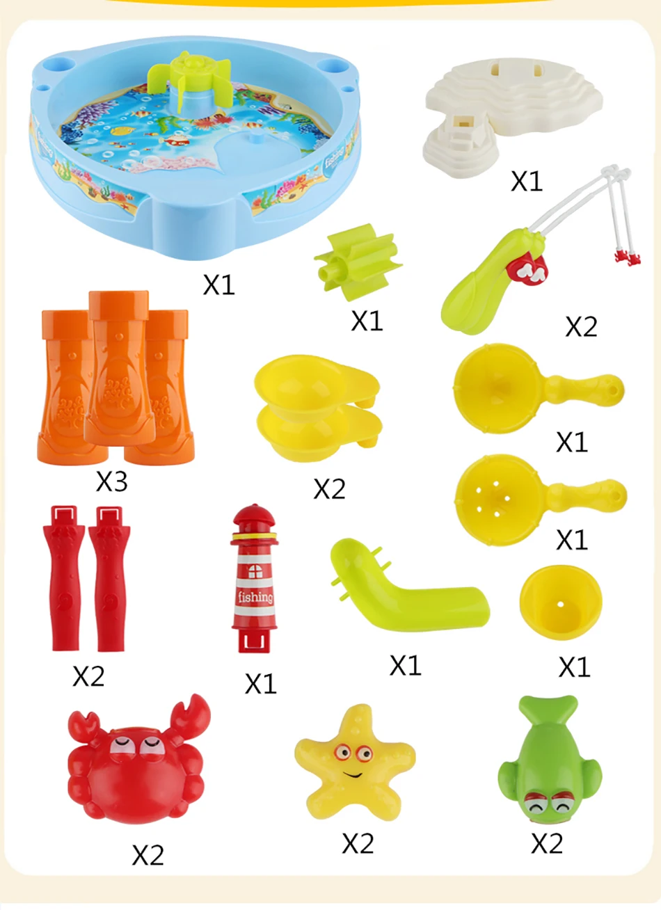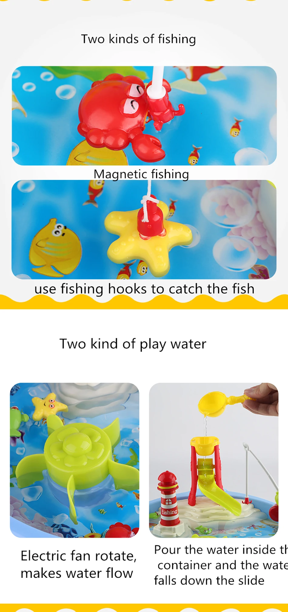 two kinds of fishing,one is magnetic fishing, the other one is using hooks to catch the fish.