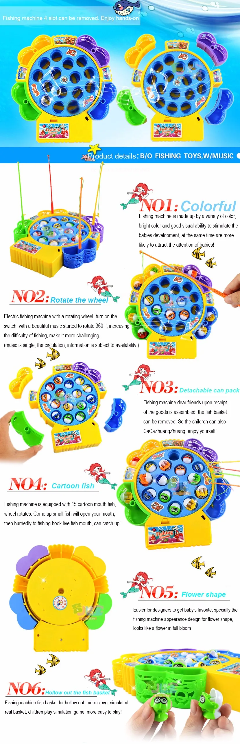 1.A rotating fishing pool with music  2.An interesting game can play with family and friends together  3.With four fishing poles, two soft rods and two hard rods  4.Improve kid’s motor skills, creativity and logical thinking ability, eye-hand coordination  5.15fish in the pool with their mouths randomly open and close  6.Fishing Toy 15 fish Electric Fish best gift for Kids Children Educational Toys Rotation Moving with Music.