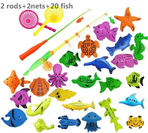 Magnetic Fishing Toy Learning&education magnetic 3D fishing toy outdoor fun&sports toy gift for baby/kid free shipping Educational Fish Pond Game Magnetic Fishing Pole Rod & Fish Model Set Kid Toy Description: Brand New and High quality Magnetic fishing toy creat endless pleasure for your children High quality material, non-toxic They can be put into the water, and make the bath time more enjoyable for kids. Fishing game helps concentrate kids attention and different types of bright vivid color of fish toy. You can also teach your baby to recognize a variety of marine animals. Two plastic fishing rod, adjustable length line, hooks with magnetic, with variety marine organisms. Specification: Size:Rod length about: 42cm Marine organisms:6-10 cm (Note:The sizes of fish model are not the same) Material: ABS environmental protection material Basket Size: 22x17x13cm Pond inflated size: 62x47x7cm (length x width x height) 20 pieces of fishing toys A pool A small Inflator