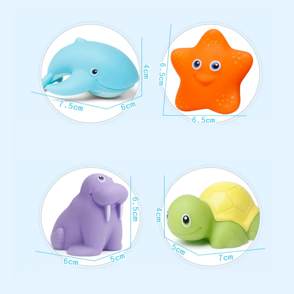 Product Details: small dolphins (water spray) small starfish (water spray) small walrus (pinch with sound) small turtle (pinch with sound)