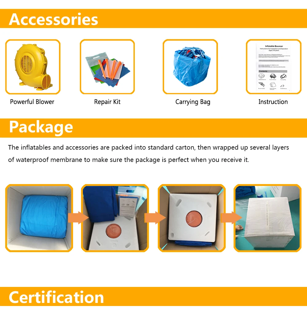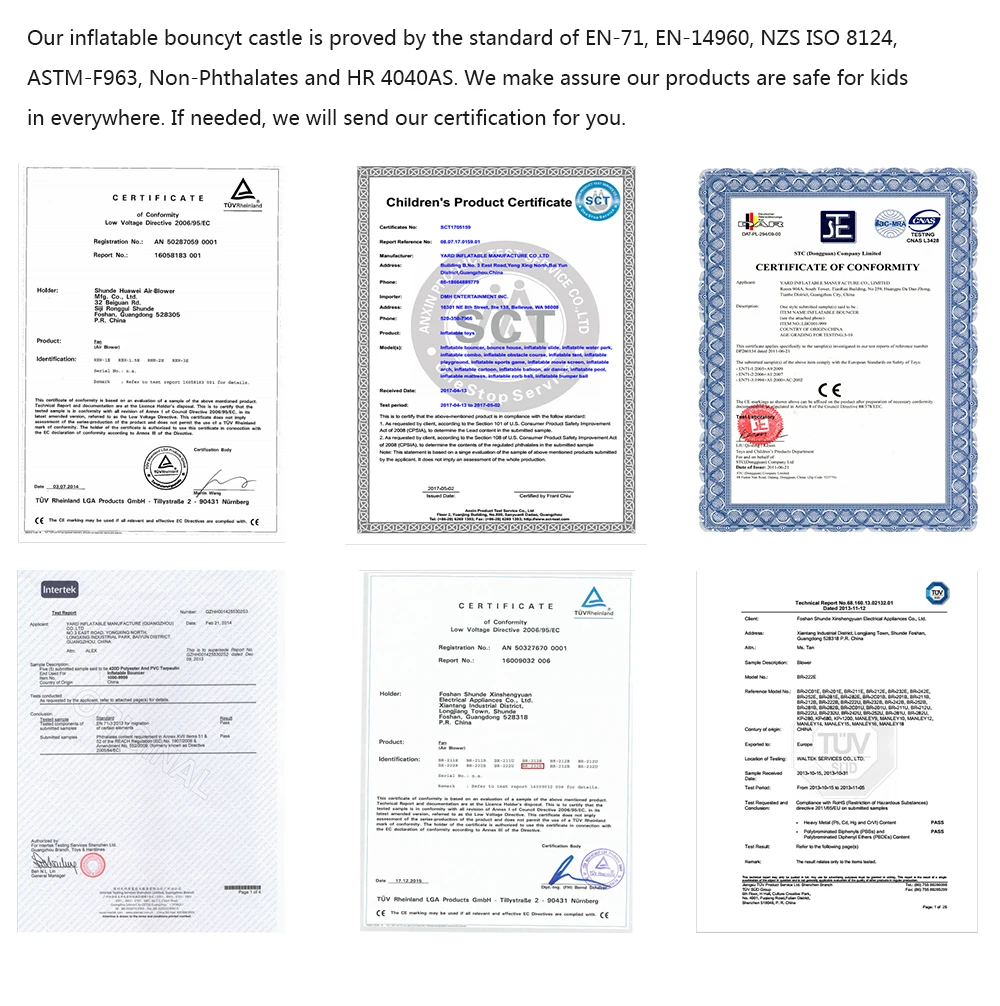 Our advantages: 1. Top quality material and handcraft: Different from other suppliers, we use commercial grade PVC on the jumping area and slides, and commercial sewing for the inflatables, this makes our quality unrivalled in the home use bouncy castle market! Others use few even no PVC for the products. The material we use for other parts are 420 D oxford coated PVC, much thicker and stronger than general oxford. 2. Designer team and factory: Our company has our own designer team and factory. We are developing new items to meet clients’ request constantly . 3. Brand name and safety standard: Our company own our brand name YARD and is well-known in inflatables market. All products have pass safety standard and necessary certificates.