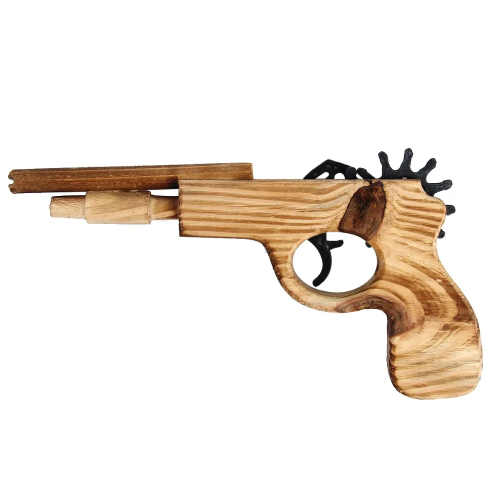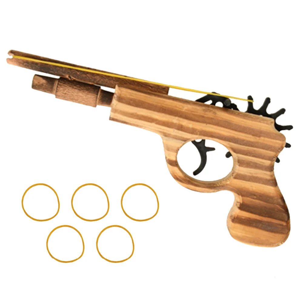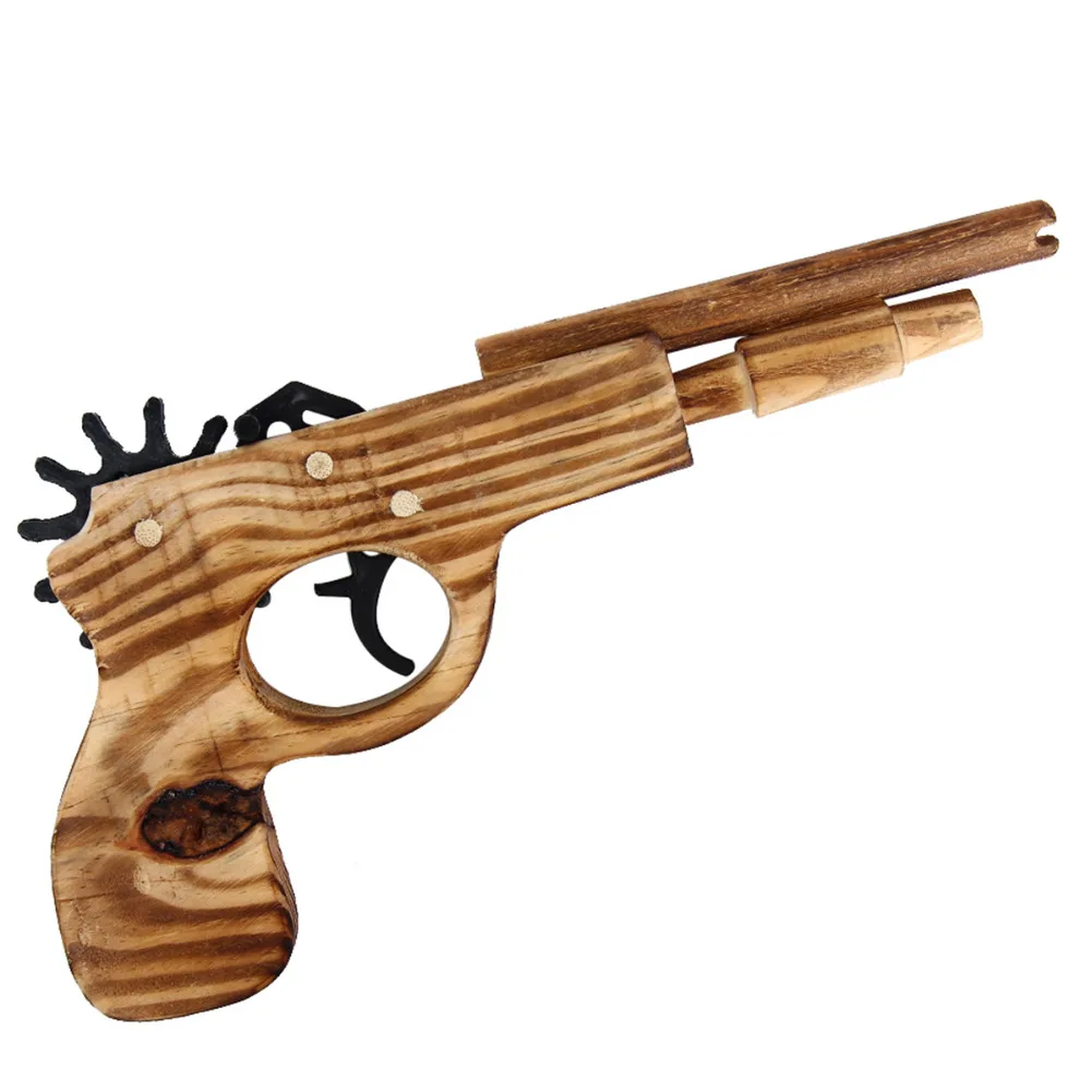 Description 1. A wooden rubber band shooting toy gun 2. Comes with a batch of rubber bands (5pcs) to get you started 3. Made of wood and has an old time, distressed look 4. The plastic wheel holds the rubber bands and shoots them off one by one as fast as you pull the trigger 5. Lightweight and easy to hold 6. Great collection or give to a younger child as a great gift Size: 12*12*2cm/4.72*4.72*0.78in Color: Wood Package Included: 1* Wooden Gun 5* Bag Rubber Bands Note: 1. Because the guns are hand-made, every one will be a slightly different cut of wood. These guns are brand new, first quality and in their original packaging, but because they are hand made, you will find occasional imperfections or irregularities. These will not affect the guns ability to shoot or function 2. Due to the difference between different monitors, the picture may not reflect the actual color of the item. Thank you!