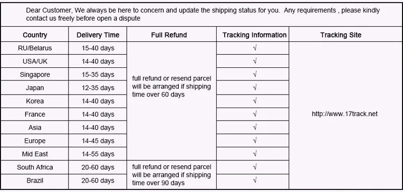 6. If you have not received your orderafter 30 days from payment, please contact us. We will trace your order and get back to you asap. Our goal is customer satisfaction!