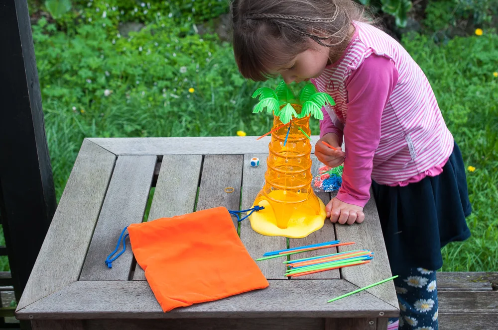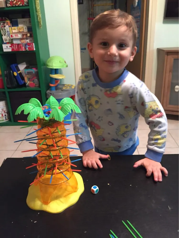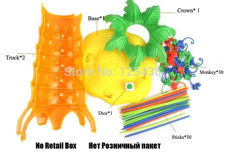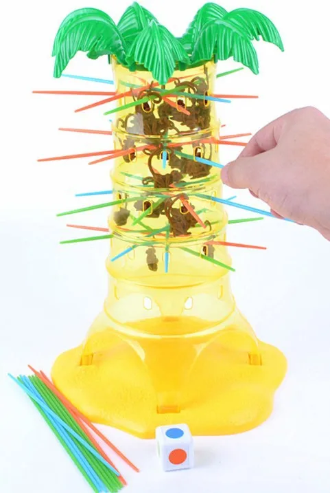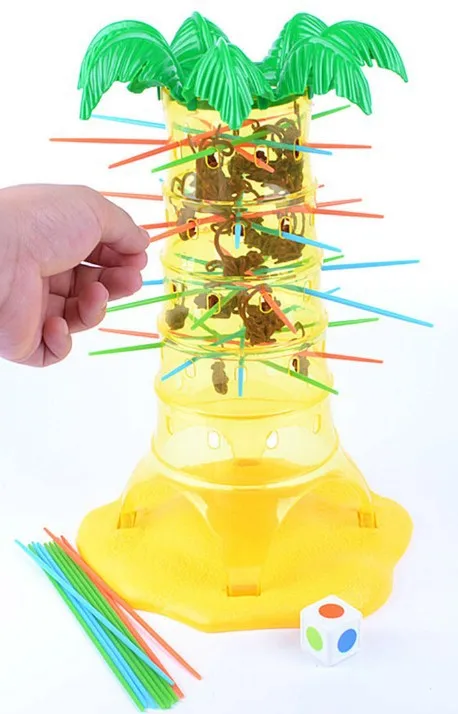 - Players place the monkeys in the tree and move the sticks according to the colored die