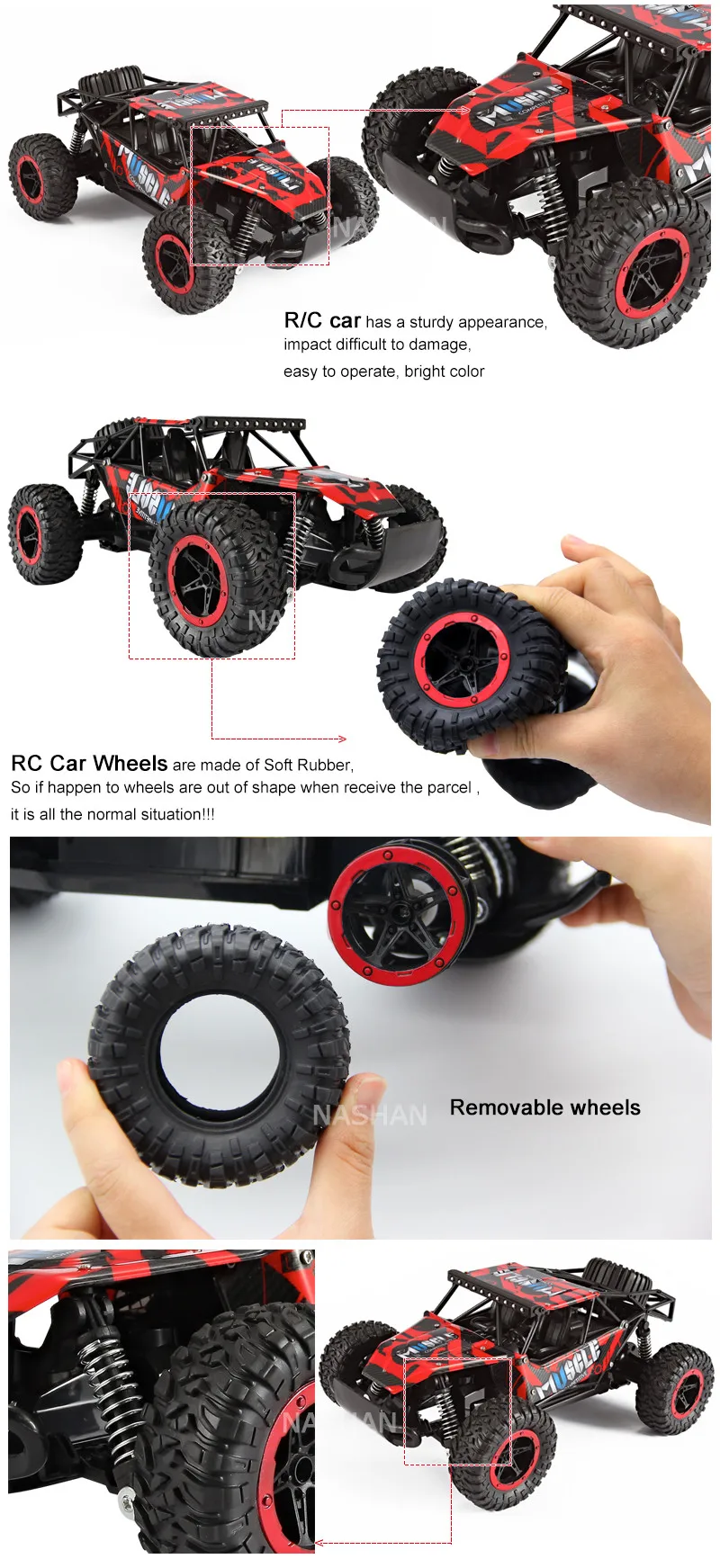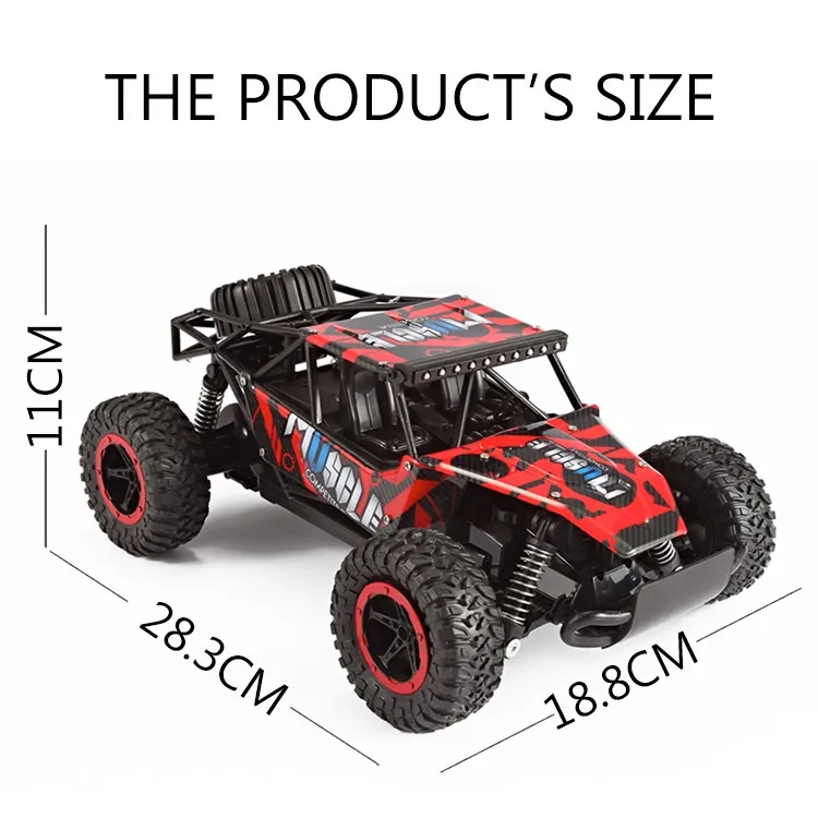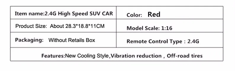 · 2.4G 2WD Remote Radio Control SUV, A Rear Wheel Drive off-road Race Trunk Toy for Grownups or kids above six years old. · Can perform incredible flip actions: Forward, Backward, Turn Left , Turn Right , Climb. · Super strong climbing force,Double powerful motors enable it to do stunner stunt, give you real experience. · Solid frame chassis, high strength composite plastic is impact resistant to help protect the crawler. · Rubber bighorn tire, aggressive tread design, impressive ground clearance, better grip in rock and off-road. · Four suspension links and springs, shockproof system and better protect the electronic components in the toy. · Wireless remote radio control, With powerful motor, speed up to 10-25KM/H. · 2.4 GHz frequency, low power consumption, strong anti-interference. · Persistent super power: Can playing more than 5 minutes. · High quality ABS material, super anti-throw ability. · A fine tuning in the crawler bottom, can adjust the direction when it is not walking in straight line. · A stunning off-road vehicle for indoor and outdoor use, such as in sand, small rocks, and other rugged land. Product Description 100% Harmless Plastic and Electronic Elements. ·Quantity:1pcs .Colors: Red ,Blue ·Charging Time: About 60 minutes